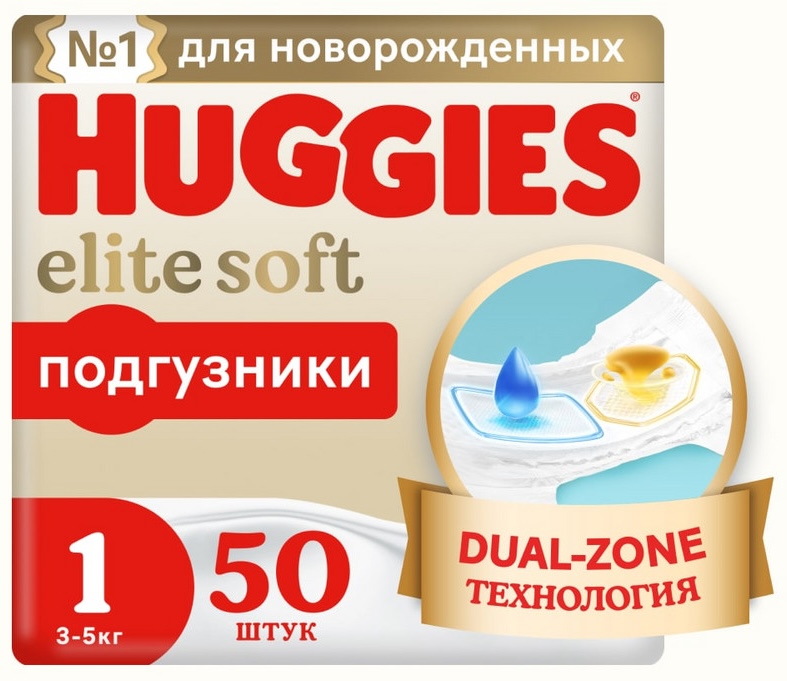 Huggies Elite Soft (1 размер) для новорожденных Jumbo 50шт